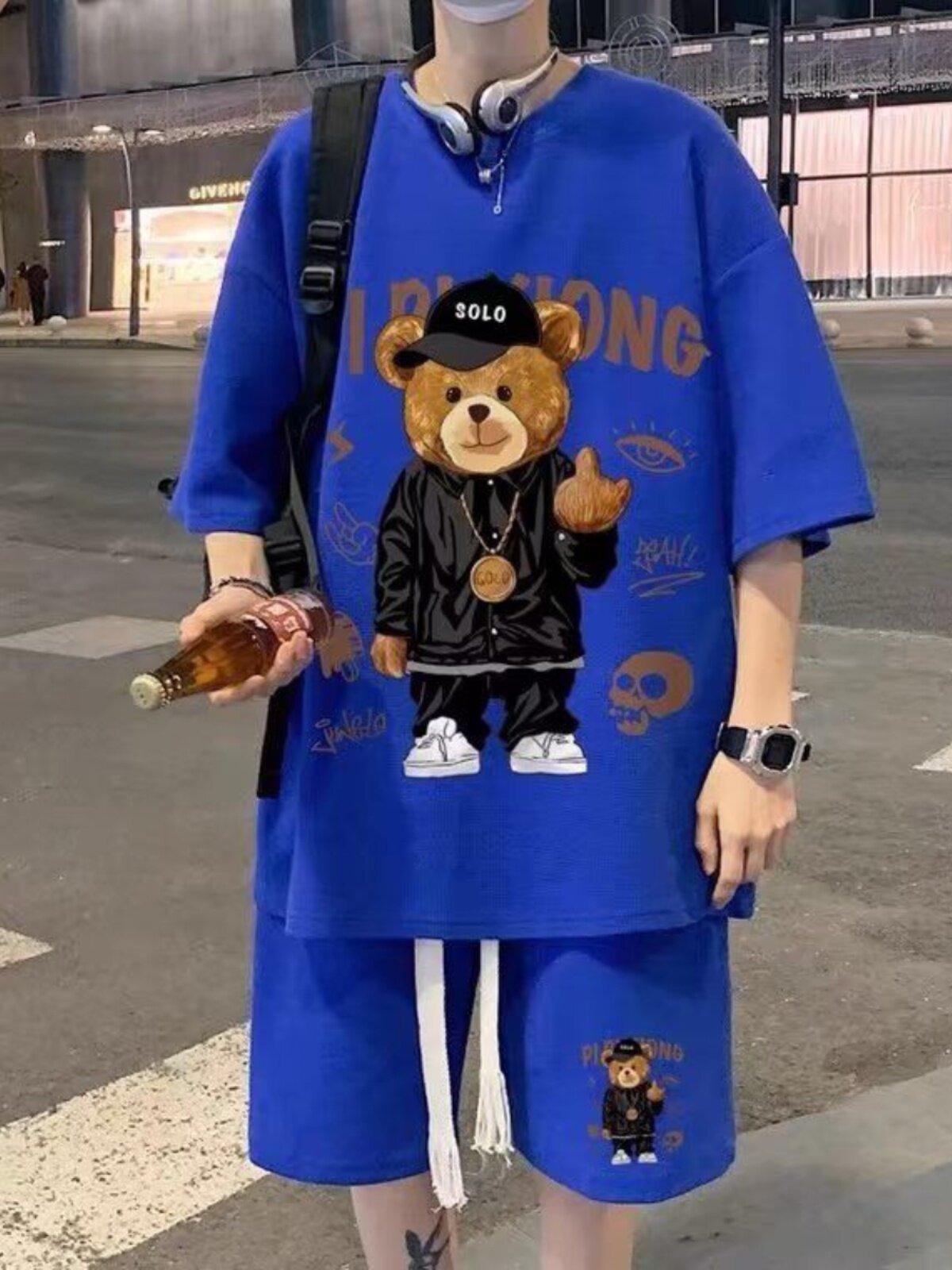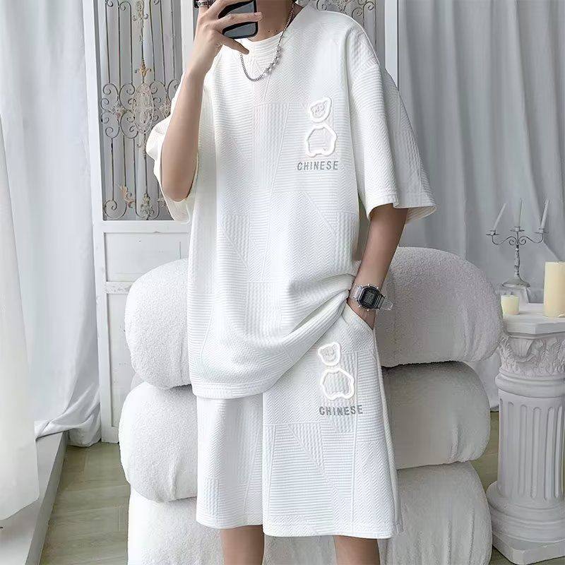 Summer New Short Sleeve T-Shirt Set Waffle Casual Versatile Sport Thin Loose Men's Summer Suit